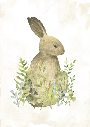 Ein Poster, das einen Hasen im Gebüsch darstellt, im Stil eines mit Aquarell gemalten Bildes, ist eine perfekte Dekoration für ein Kinderzimmer. Zusammen mit anderen Postern aus der Serie wird es eine unglaubliche Waldatmosphäre im Kinderzimmer schaffen.