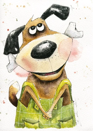 Rufi the dog has a bone and wishes you a good day! This illustration was hand-painted with watercolors, then scanned and printed in high quality.