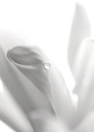 The 'Drop' poster is a mesmerizing monochromatic piece that breathes tranquility and simplicity into any space. It features an intimate and delicate portrayal of a solitary droplet poised on the brink of falling from a petal, captured in a high-key grayscale palette. The subtle gradients of white and gray, playing with soft light and gentle shadows, lead the eye towards the pristine droplet, which stands as the focal point amidst the soft contoured lines of the surrounding petals. The composition hints at the principles of minimalist design while evoking a serene sense of purity and balance.