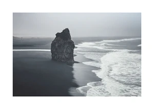 Discover the serene beauty of the 'Sea' poster, a captivating addition to any room seeking a touch of tranquility and natural elegance. The monochromatic palette of soothing grays and soft blacks gracefully captures the gentle dance between sea and shore. A solitary, majestic rock formation stands as a silent sentinel, defying the fluid force of the ocean waves that caress the expansive beach. The minimalistic composition, with its vast negative space and absence of human elements, invites introspection and a profound appreciation for nature's solitary displays.