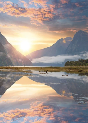 This poster shows a picturesque mountain landscape at sunset, reflected in a calm lake, combining soft shades of orange and blue, which attracts the eye and creates a harmonious atmosphere full of peace, perfect for a living room or office to create a relaxing and inspiring space.