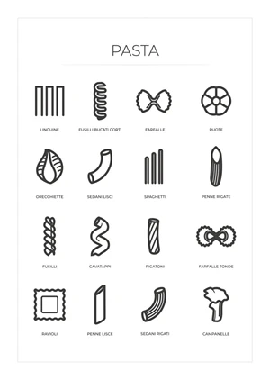 Introducing 'Pasta,' a sophisticated and minimalistic poster that serves as a tribute to one of the world's most beloved culinary arts. With a clean and airy white background, the poster features an array of elegantly illustrated pasta shapes. Each shape, from the slender strands of Linguine to the whimsical twists of Fusilli, is rendered in a detailed yet understated black line art, capturing the essence of these Italian staples with a touch of modern simplicity. Accented by a graceful, sans serif typeface that labels each variety, the black and white palette offers versatility, ensuring the poster can complement any decor style with ease.