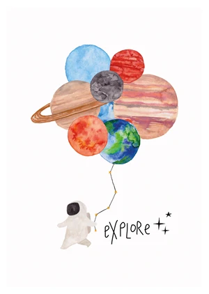A fun poster depicting an astronaut with planet-shaped balloons will remind you that there is so much to learn every day of your childhood.