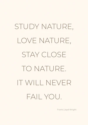 The 'Natura' poster exudes a serene simplicity that speaks to the soul, featuring an elegant, minimalist design that invites a moment of contemplation. A delicate, neutral palette forms the backdrop, evoking the soft hues of natural parchment, and providing a soothing visual experience that harmonizes with any decor. The typography is thoughtfully chosen, marrying clarity with a modern sensibility, and the text flows gracefully, guiding the eye through a meditative quote from the acclaimed architect Frank Lloyd Wright. This tasteful composition is devoid of superfluous elements, relying instead on the power of words and the ample negative space to make a profound statement.