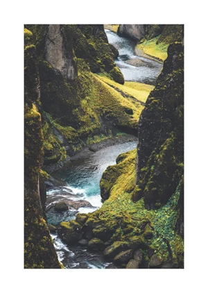 Immerse yourself in the serene majesty of nature with 'Among Rocks', a compelling landscape poster that captures the untamed beauty of a secluded rocky canyon. The rich color palette emphasizes deep mossy greens and earthen browns, contrasted sharply with the soft whites and grays of the flowing river. Your gaze is drawn along the meandering waterway, which serves as the poster's lifeline, nestled between towering cliffs that stand as weathered sentinels over time. The harmonious interplay between light and shadow renders the scene with an almost ethereal quality, while the fine details of the rock textures and the delicate overlay of moss suggest a scene where nature's artistry takes center stage.