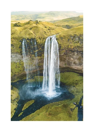 Embrace the serene beauty of nature with our 'Waterfall' poster, a breathtaking portrayal of one of nature's most elegant creations. The poster features a stunning high-resolution image of a majestic waterfall cascading into a tranquil pool below. With its exquisite clarity and vibrant color palette, this piece showcases the striking contrast between the lush greenery of the surrounding landscape and the vivid blue of the water, creating a visually refreshing experience. The artful composition draws the viewer's eye through multiple levels of natural beauty—from the soft, misty spray of the waterfall to the textured, rolling hills in the distance. Dominating the scene, the falls create a powerful focal point, embodying both the grace and raw power inherent in the natural world.