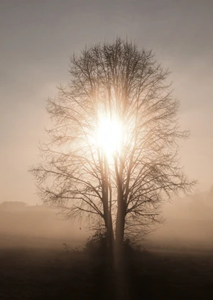 The poster features a minimalist composition with a tree illuminated by the rising sun, giving it warm, golden tones and creating a calming atmosphere perfect for a living room or office.