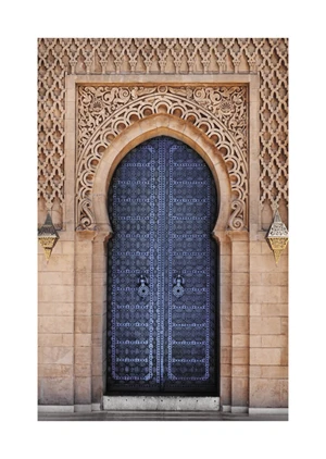 Introducing 'Blue Door,' a captivating poster that encapsulates the essence of architectural elegance and cultural richness. The image features an imposing blue door set within a beautifully carved stone archway that speaks of meticulous craftsmanship. The regal blue tone of the door creates a striking contrast against the beige of the ornate wall, while the intricate patterns etched into the surface exude an air of sophistication and mystery. Accentuating this visual symphony, two lanterns flank the entrance, their traditional design adding a touch of warmth to the composition. This poster effortlessly attracts attention, dominating the space with its commanding presence and exquisite detail.