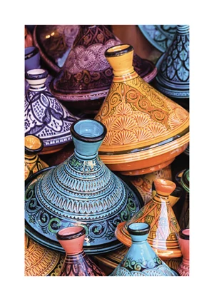 The 'Color Festival' poster is a vibrant celebration of pattern and color, a feast for the eyes that captures the essence of cultural artistry. The image presents an assortment of traditional ceramic pottery, each piece intricately adorned with ornate designs. Rich hues of cobalt blue, earthy terracotta, mustard yellow, and deep purples dominate the palette, creating a kaleidoscope effect that is both warm and inviting. The composition of the poster is a harmonious clutter of shapes, with each vessel boasting unique motifs, from delicate filigree patterns to bold geometric shapes. This carefully curated visual chaos draws the eye across the image, encouraging the viewer to linger on the individual details of each artisanal creation.