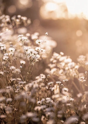 The 'Meadow' poster is a beautifully serene composition that brings the subtle enchantment of a sun-drenched field into any space. It captures the delicate dance of light amid wildflowers, with a palette dominated by warm, golden hues and soothing earth tones. Light filters through the scene, lending each flower a gentle glow and creating soft contrasts that draw the eye. Flashes of white from the flowers' petals add a touch of purity to the poster, while the bokeh effect in the background contributes to an overall dreamy, ethereal quality. The composition skilfully balances the fine details of the meadow's flora against the diffused light of the setting sun, creating a focal point that is both mesmerizing and harmonious.