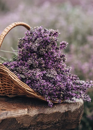 The 'Lavender' poster exudes the serene elegance of nature with a stunning display of lavender flowers resting in a traditional wicker basket, placed upon an aged wooden surface. The color palette is dominated by calming tones of purple and green, extending into a soft, out-of-focus background that ensures the subject holds the viewer's attention. Such detailed attention to the lavender's texture and the basket's woven craftsmanship, combined with the rustic charm of the wood, creates a harmonious composition that brings an organic and peaceful ambiance to any space.