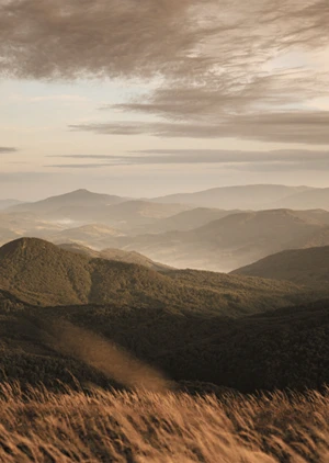 Immerse yourself in the serene tranquility of the 'Bieszczady' poster, a captivating portrayal of one of nature's most enchanting landscapes. Enveloped in a palette of soft, earthy tones, this piece exudes warmth and natural elegance. The interplay of gentle browns, muted greens, and hazy blues captures the romantic essence of the Bieszczady mountains, drawing the viewer into a scenic reverie. Dominating the composition is the grandeur of rolling hills, receding into the mist, while the foreground is graced with whispering grass, creating a sense of depth and solitude. The subdued, natural light depicted conjures an early dawn or late afternoon, where the sun casts a peaceful glow, highlighting the textures of the landscape and bringing the scenery to life.