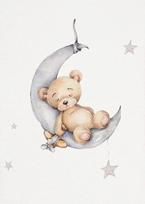A poster depicting a sleeping teddy bear. The illustration is styled to resemble a watercolor painting.