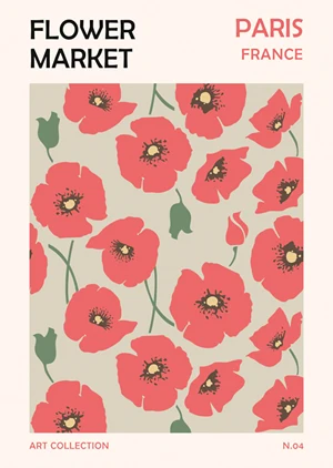 Embrace the vibrant charm of the 'Flower Market 4' poster, a delightful addition to any space seeking a burst of floral elegance. The poster flaunts a series of exquisitely styled poppies in a refreshing coral-pink hue set against a mellow beige background, crafting a warm yet lively atmosphere. The flowers, with their bold black centers and dainty green stems, are arrayed in a natural, scattered pattern that captures the essence of a breezy day at an open-air market. The simplicity of the design, paired with its striking color palette, ensures the poster stands out, while its uncluttered composition allows it to blend seamlessly with a variety of decor styles.