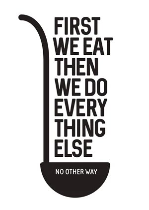 Embrace the minimalistic elegance of 'Pierwszy,' a poster exuding modern sophistication and a playful twist on typographic art. The design features a stark black-on-white scheme, where words cascade down a stylized ladle, their bold, sans-serif type amassed within its bowl - a symbolic marriage of culinary passion with the clarity of print. Dominating the visual field is the poignant phrase, "FIRST WE EAT THEN WE DO EVERYTHING ELSE," with a grounding footer that pronounces, "NO OTHER WAY" – a testament to the perennial significance of nourishment in our lives. Engaging in its simplicity, the poster captivates with clean lines and strong contrast, drawing the viewer's eye and punctuating any space with its commanding presence and uncluttered aesthetic.