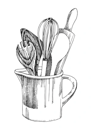 'In the Kitchen' is a captivating monochromatic poster that teems with the essence of culinary artistry and domestic charm. Set against a crisp, white backdrop, the illustration features a meticulously detailed, sketched mug overflowing with quintessential kitchen utensils—wooden spoons, a whisk, and a spatula—all rendered in fine, delicate linework. The stark contrast of the black-and-white palette highlights the textures and shadows, lending an almost tangible quality to the composition. The understated elegance of the poster draws attention to the simplest of kitchen items, transforming them into a tableau of home life and creativity.