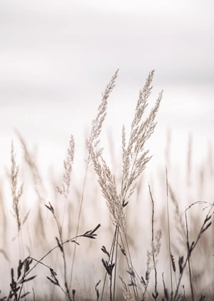 Introducing 'Peace,' a serene and evocative poster designed to bring a sense of tranquility and natural elegance to any space. The poster showcases a gentle composition of wild grasses, possibly in a meadow or along a lakeside, with each delicate blade etched against a subtly gradated background moving from a soft, hazy white at the top to gentle tones of beige near the bottom. The soft focus and muted color palette of whites and earthy tones lend an air of calmness and sophistication, while the play of light and shadow on the slender grass stems creates a sense of depth and texture. The organic curves and feathery tops of the grass invite the viewer to contemplate the beauty of simplicity and the grace of nature's own designs.