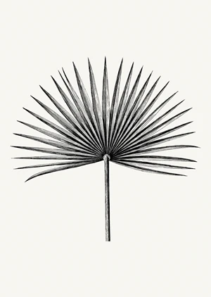 This minimalist poster features a stylised black and white palm leaf on a light background, echoing the popular trend of botanical art illustrations, creating an atmosphere of calm and elegance, perfect for a living room or office, where it brings a touch of nature and modern chic.