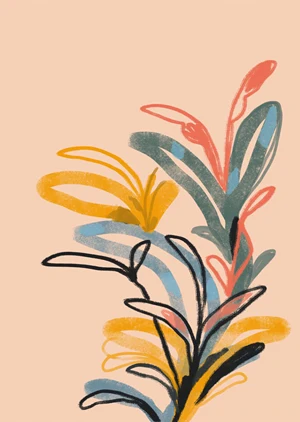 Introducing 'Colorful Leaves', a captivating artistic poster that embodies both simplicity and vibrancy through its creative interpretation of nature's beauty. The composition is a harmonious collage of free-flowing foliage, illustrated in a palette of warm yellows, serene blues, and passionate reds, offset by soothing earth tones. These elements coalesce on a subtle peach background that accentuates the leaves' delicate outlines and soft brushwork. The minimalist approach ensures each color sings harmoniously with the next, evoking the change of seasons or the serene dance of leaves in a gentle breeze. The organic shapes and fluid lines suggest movement and bring an element of whimsy and relaxation to any space.