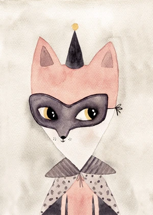 A poster featuring a fox wearing a mysterious carnival mask. Stylized to resemble a watercolor painting.