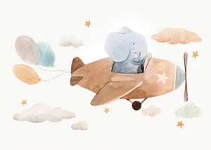 A poster featuring a cute elephant on a plane. Adventure awaits!