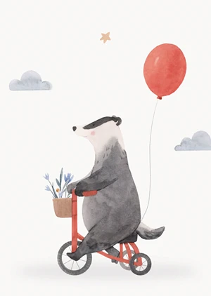 A poster featuring a charming badger on a bicycle. Styled to resemble a watercolor painting, this poster is ready for adventure!