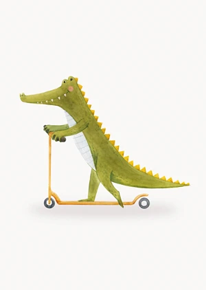 A poster with a cute green crocodile on a scooter.