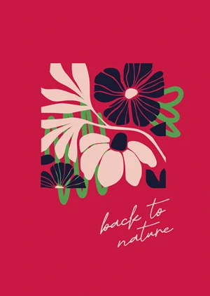 Immerse yourself in the botanical elegance of 'Natura,' a captivating poster designed to infuse any room with the essence of the natural world. Dominated by a rich, crimson backdrop, this piece artfully combines the simplicity of modern design with the intricate beauty of floral elements. Bold, overlapping motifs of flowers and foliage in shades of pale pink, ivory, and deep green capture the eye, creating a vibrant contrast against the deep red. The central composition of the poster is both harmonious and striking, with stylized forms that evoke the Art Nouveau era's love for organic lines and the bold color schemes reminiscent of modernist artworks.