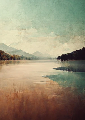 The poster depicts a picturesque landscape with a lake surrounded by hills and gently blurred colors of green and blue, creating a calm and harmonious atmosphere in an impressionist style, perfect for hanging in a living room or office to introduce soothing, natural energy into the interior.