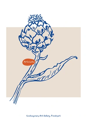The 'Artichoke' poster is an exquisite piece of wall art that captures the subtle beauty of the natural world through a minimalist lens. The composition is elegantly simple, featuring a single, stylized artichoke plant set against a soft, neutral background that provides a contemporary touch to its aesthetic. Dominated by a crisp, navy-blue outline, the artichoke's form is both abstracted and recognizable, giving it a visual punch that attracts attention without overwhelming the viewer. A small pop of color is introduced with the playful, red round sticker bearing the title 'Artichoke,' adding a modern twist to the otherwise traditional subject matter.