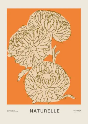 Discover the "Naturelle" poster, a striking harmonization of warm tones and botanical elegance. The design features a duo of beautifully detailed peonies, their petals and leaves intricately etched in a delicate white outline that contrasts vividly against the vibrant coral background. The composition is both balanced and thoughtful, emphasizing the organic contours and texture of the blooms. The poster's minimalist approach to color—pairing the purity of white with the energy of orange—creates a dominant visual effect that captivates and commands attention.