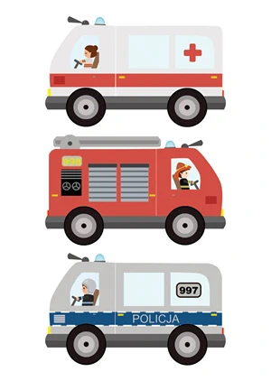 A colorful poster depicting an ambulance, police car and fire truck is the perfect addition to a child's room.