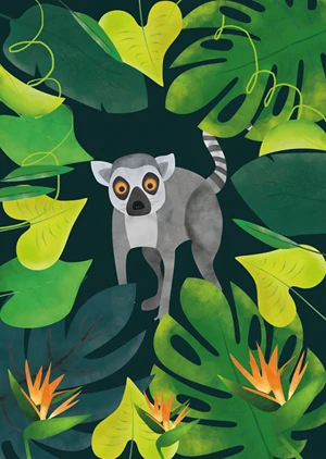 This lush green poster, straight from the jungle, features a charming, slightly frightened lemur. This illustration will make a beautiful addition to your home decor.