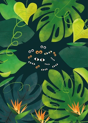 A lush green poster with mysterious eyes, straight from the jungle. This illustration will make a beautiful addition to your home decor.