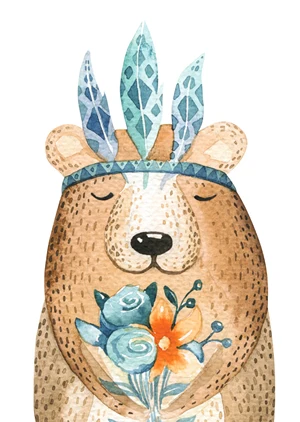 This watercolor-style poster depicts a teddy bear holding a bouquet. Along with other posters from the "Forest Friends" series, it will enliven any space.