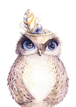 This poster, styled as a watercolor painting, depicts an owl. Together with other posters from the "Forest Friends" series, it will enliven any space.