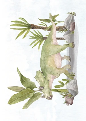 Triceratops, a three-horned herbivore. This colorful poster of the dinosaur will make a unique wall decoration in a child's room. It's the perfect illustration for fans of these fascinating animals.